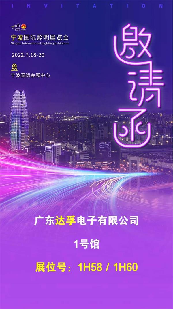 7月18-20日,2022寧波國際照明展,達(dá)孚電子1號(hào)館1H58-60歡迎新老朋友蒞臨指導(dǎo)交流。